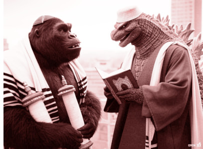 The year is 2025 and many of the Kaiju have converted to Islam. Those which haven't were killed in the Titan Intifada upon the ancient grounds of Har Megiddo, including Mothra and Shimo, who were both raped and beheaded by a mob of Islamic Kaijin. The only remaining infidel is King Kong, who has been circumcised with an atomic plate of flint that has infused him with invincible powers of hutzpah. After Godzilla charges up at a secret Iranian nuclear power plant, the two will meet in Jerusalem to battle it out atop Mount Zion. The whole world will be watching as monster religions clash for one final battle of Abrahamic ideals. The Israelis have a few surprises, including an army of copyright lawyers, which will surely work to Kong's benefit. However, the skies are filled with terror drones and members of ISIS have tunneled to Hollow Earth to kidnap Jia with the intent of raping and beheading her on the Temple Mount unless Kong surrenders. With assistance from U.S. and Chinese scientists, the World Health Organization will deliver a virus that is sure to kill all remaining Titans, however, the residual damage to humans could mean a population reduction on par with the Bubonic Plague of the fourteenth century. Also, the extraterrestrial reptilians from the Alpha Draconis star system have decided that now is the best moment in human history to finally reveal themselves — but is it to help or to hinder mankind? Will the mysterious appearance of a swine Kaiju prove an unexpected ally for the Jews? Will the Al-Aqsa Mosque remain standing? And will Kong use the Muslim call to prayer as an opportunity to attack? Toho Entertainment Ltd., in conjunction with Warner Brothers Pictures and Legendary Pictures, team up to bring you Kong, King of the Jews. Directed by Adam Wingard. Starring Rebecca Hall, Fala Chen, Ben Kingsley, Awkwafina, Jeff Goldblum, and Samuel L. Jackson. Image by Grok. This ad was sponsored by The Goonies 40th Anniversary, in theaters this month.